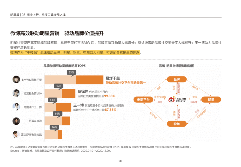 品牌营销方面,微博作为“中转站”,全面联动品牌、明星、粉丝、电商四大引擎,打造出闭合营销生态体系。而明星社交资产可以高度赋能品牌营销,根据《白皮书》的“品牌微博互动贡献度明星TOP5”显示,易烊千玺代言 BMW 后,品牌官微互动量大幅增长;蔡徐坤代言后三个月内 品牌社交美誉度提升至99.38%;代言后三个月内品牌官微大幅增粉,新增粉丝中王一博粉丝占比87.58%。
