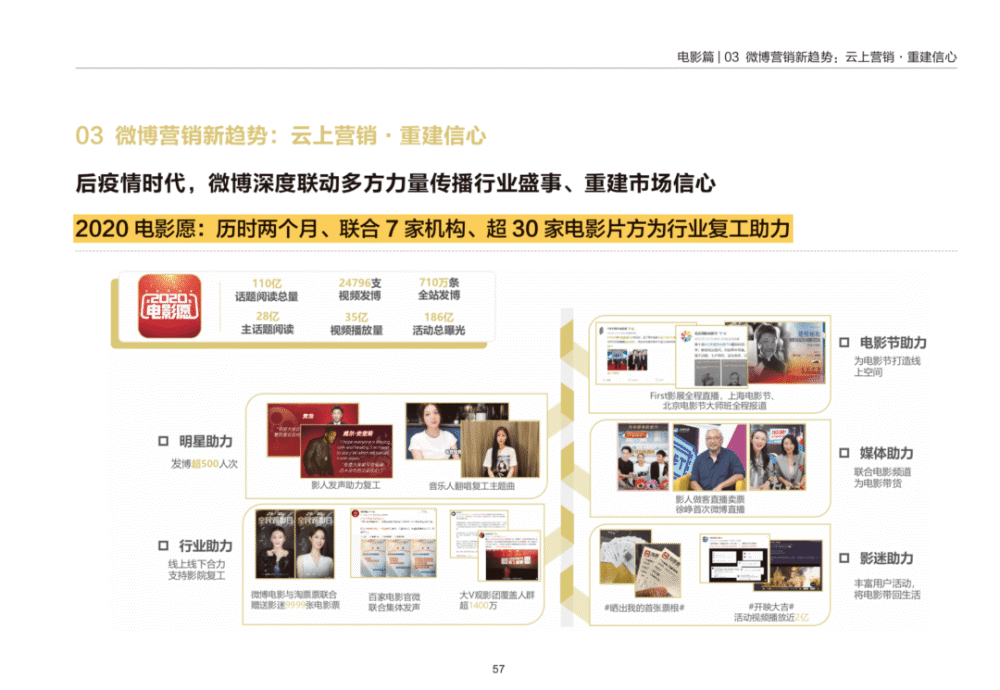 比如针对电影复工,在后疫情时代,微博通过平台力量,历时2个月,联合超500位明星、7家机构、超30家片方以及媒体、影迷等,发起“2020电影愿”,为电影复工加油打气。