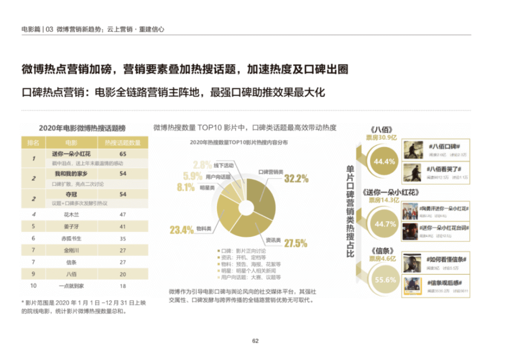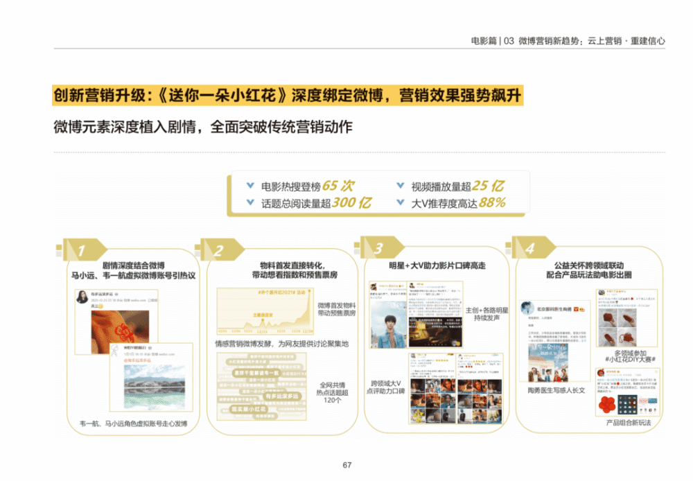 以具体项目为例,由韩延指导,易烊千玺、刘浩存领衔主演《送你一朵小红花》曾于2020年12月31日跨年公映,截至撰稿,影片斩获了14.32亿票房。复盘其营销,可以看到,电影曾深度绑定微博,全面突破传统营销动作,曝光效果强势飙升。