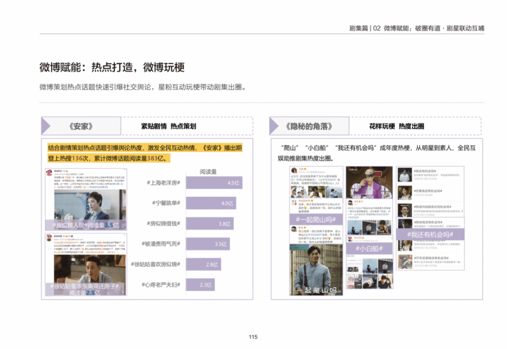 再以剧综为例,针对剧情或者节目桥段,微博会策划相应的热点话题,借助热搜,让作品的梗引爆社交舆论。配之主创采访、行业矩阵活动,跨界品牌联动等其他方式,全方位提升作品热度。
