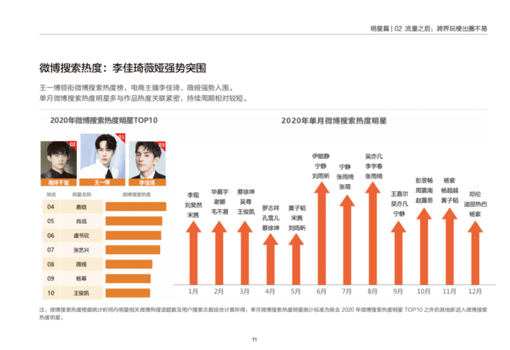 当然,大热影视综依然是明星提升热度的重要渠道。比如《隐秘的角落》的秦昊,《青春有你2》的虞书欣等。此外,基于电商带货的盛行,主播李佳琦和薇娅成为了大众熟知的明星,两个人强势入围了年度微博搜索明星TOP10。