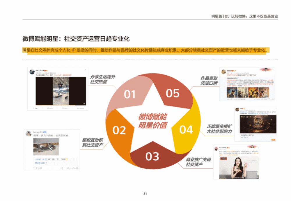 明星能够在社交媒体完成个人化IP的塑造。他们以个人IP为内核,积累社交资产的主要方式为:分享生活提升社交热度,参与拍摄优质作品,增强星粉互动量,带动商业推广变现,传播正能量,扩大社会影响力。由此可见,微博可微博全方位多角度为明星价值赋能。