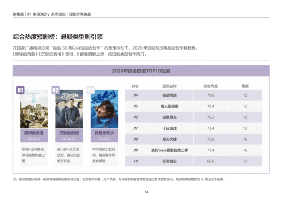 爱奇艺的“迷雾剧场”主打12集的精品短剧,以悬疑类型为突破口,填补了电影和长剧之间的中间语境。以《三十而已》为代表的女性视角作品逐渐高热,突显了“中女崛起”的概念。而《在一起》《安家》《以家人之名》等关注原生家庭、时代事件、社会民生等大众议题的现实题材作品依然是观众最爱。
