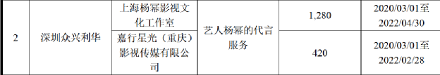 根据招股书数据,欢乐家集团负责销售的子公司众兴利华与上海杨幂影视文化工作室签订的从2020年3月1日至2022年4月30日为期2年零2个月的代言合同金额为1280万元,与嘉行传媒从2022年3月1日至2022年2月28日的合同金额为420万元,合计1700万元。