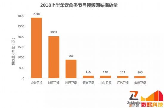截至2018年6月30日,安徽卫视饮食类节目以2916万播放量跃居各卫视饮食类节目视频网站播放量排行第一;浙江卫视和陕西卫视分别以2029万、901万位列第二、第三。