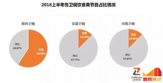 陕西卫视全类型节目播放量情况中,饮食类节目位居第一,占比59.03%;安徽卫视饮食类节目排名第八,占比12.23%;河南卫视饮食类节目位列第三,占比12.03%。