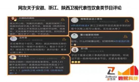 综合来看,安徽、浙江、陕西三大卫视是今年上半年饮食类节目传播的主力军。安徽卫视总播放量第一,有3档饮食类节目(代表性节目为《蜜食记第三季》),传播力度大的同时也对饮食类节目比较重视;浙江卫视只有1档饮食类节目《熟悉的味道第三季》,且开播时间(5月27日)最晚,从5月27到6月30短短一个月播放量跃升至第二,可谓势头迅猛;陕西卫视播放量虽然排第三,但饮食类节目在其全类型节目总播放量排名中位居第一,说明陕西卫视各类节目中饮食类节目非常受欢迎。同时,通过网友的评论可以看出观众对这三大卫视播出的饮食类节目认可度较高。