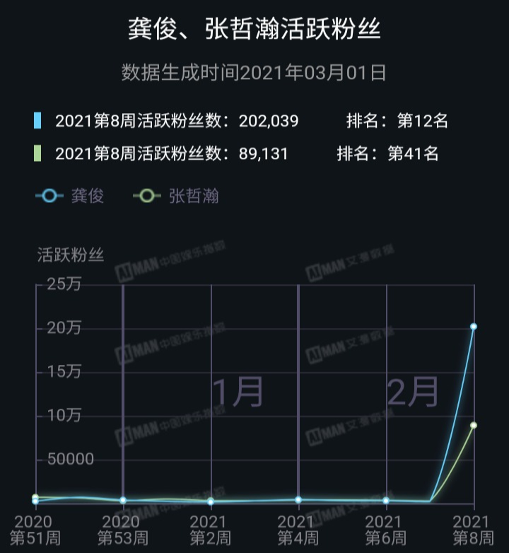 根据艾漫数据显示,2021年第八周(2月22日—2月28日),二人活跃粉丝数迎来大幅增加,其中龚俊活跃粉丝数为20万+,排名第十二,张哲瀚位列第41位,而前一周两人则还排在600名开外。