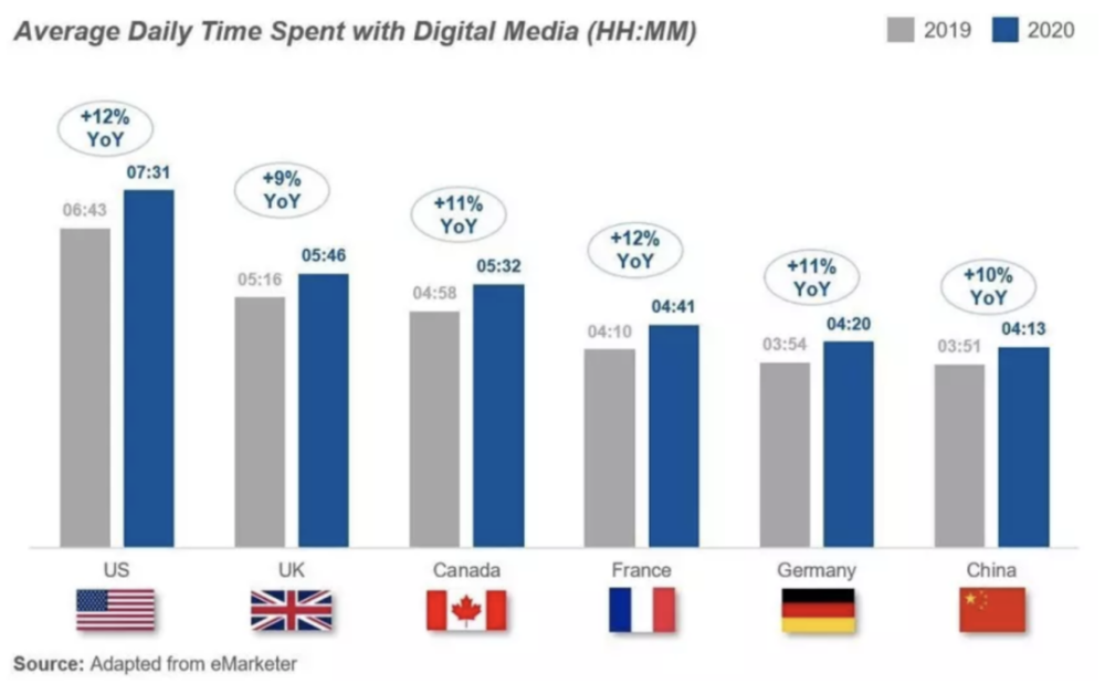 【2019与2020年全球主要六个国家的日平均数字媒体使用时间增长图表】