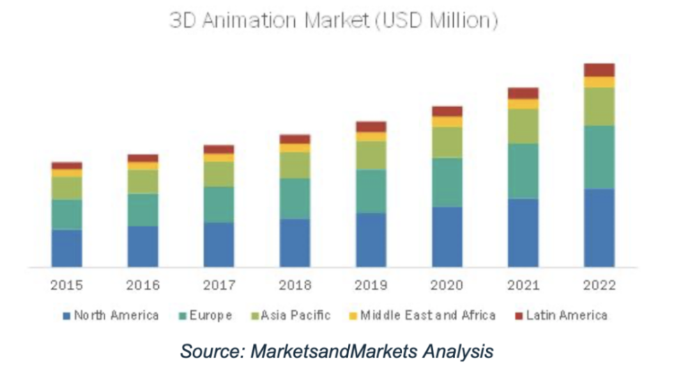 【图表显示,一直到2022年,世界范围内对于3D渲染动漫产业的增长看好】