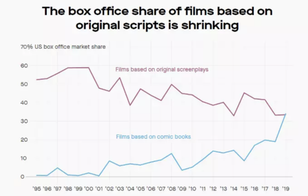 【数据显示,美国2019年以后,由动画改编的影视作品正逐渐超越传统大银幕放映的作品】