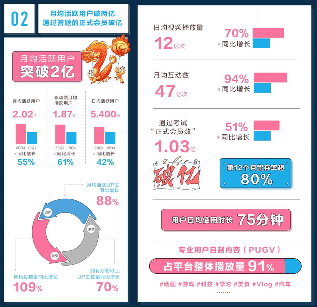 不仅如此,根据哔哩哔哩2020年Q4及全年财报显示,用户日均使用时长达75分钟,会员第12个月留存率超过80%,黏性相当惊人。