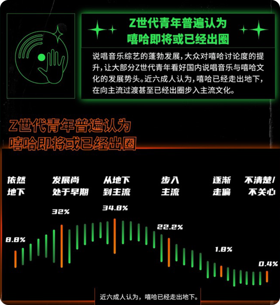 有近六成Z世代认为说唱所指向的嘻哈文化已经实现出圈,并有41.2%的说唱青年将嘻哈或说唱用语作为口头禅,比如“skr skr、想要成为rap star吗”等,都是他们最耳熟能详的嘻哈梗。(QQ音乐x青年志《说唱青年秘密图鉴》)