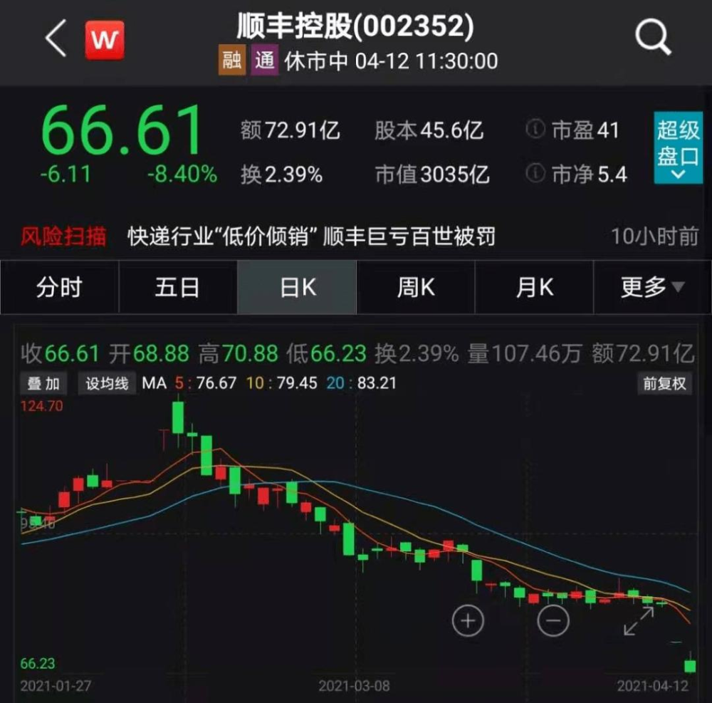 4月8日晚,顺丰控股(002352)发布2021年第一季度业绩预告显示:顺丰控股预计今年1至3月份净利润亏损9亿元至11亿元,对比去年同期盈利则为9.07亿元。扣除非经常性损益后,顺丰预亏10亿元至12亿元,去年同期盈利8.32亿元。4月9日,顺丰控股全天一字板跌停。截至午间收盘,顺丰控股股价为72.72元,成交额为14.5亿元,最新总市值为3313亿元;总市值半日蒸发约569亿元。董事长王卫为此道歉。白马股爆雷波及16万股民,当日“顺丰跌停”登上微博热搜第三。