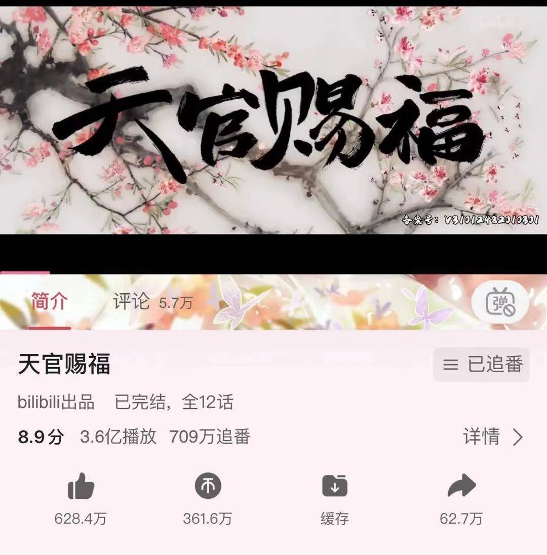 2019年,B站正式立项根据墨香铜臭同名小说改编的动画《天官赐福》,消息一出,备受行业内外瞩目。时隔一年多,《天官赐福》正式上线B站,还原原著,制作上独具匠心,让其取得了口碑与点击量的成功。播出期间多次登上国内外社交网站的热搜和趋势榜单,在海外权威动漫网站MyAnimeList,动画评分8.8,一度高居世界总榜的TOP22。