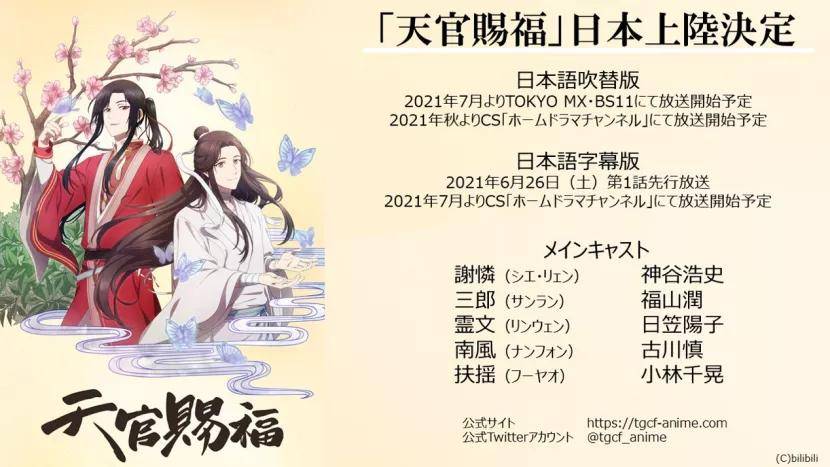 继4月9日登陆Netflix之后,近日, Sony宣布《天官赐福》再登日本的消息引发动画行业热议。报道称《天官赐福》日语配音版,将在7月登陆日本地上波Tokyo MX 频道和卫星电视频道BS11,并正式公开CV阵容:谢怜:神谷浩史,三郎:福山润,灵文:日笠阳子,南风:古川慎,扶摇:小林千晃,如此神仙阵容,粉丝们直呼要过年了。
