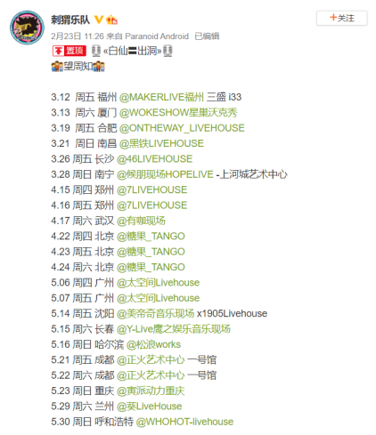 除此之外,痛仰也要辗转四城,九连真人、重塑、马思唯辗转三城,新裤子、马赛克等也都有两场演出。至于其它热门乐队,即便躲得了五一,也躲不过近期的旺季,点开刺猬乐队的微博,尽管五一期间没有演出,但同样行程拉满,从3月12日到5月30日共有22场演出。