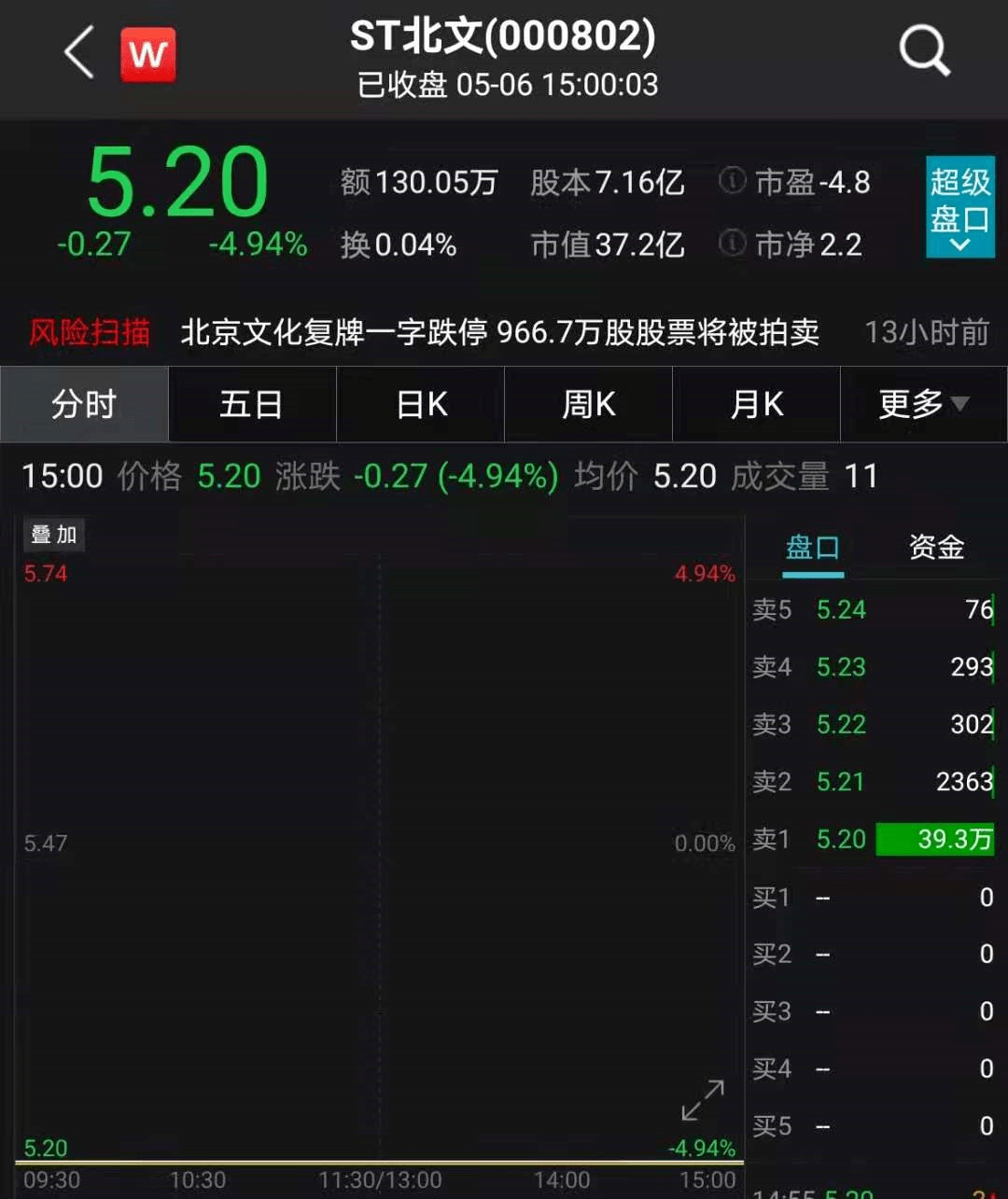 今天(5月6日)刚刚被ST的北京文化,毫无意外地一字跌停,39万手卖单把ST北文的股价死死摁在跌停板上。