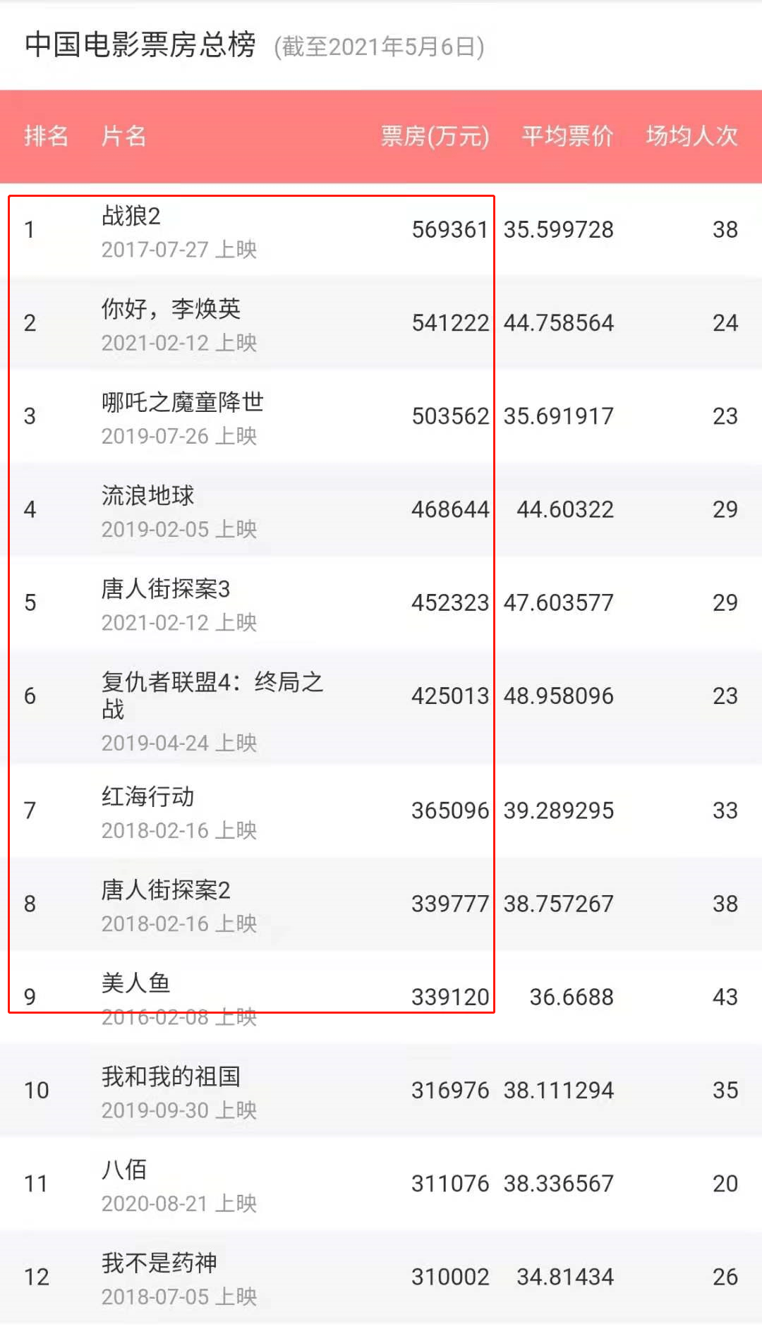 截至目前,中国电影票房史上,仅有9部电影的票房能够达到33亿元以上。