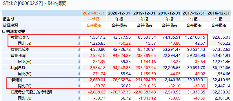 根据公告, 北京文化2020年营收4.26亿元,同比下降50.22%;归属于上市公司股东的净利润为-7.67亿元 ,同比上升66.72%。2021年一季度,公司营收及归属于上市公司股东的净利润分别为1561.12万、-2688.62万元。