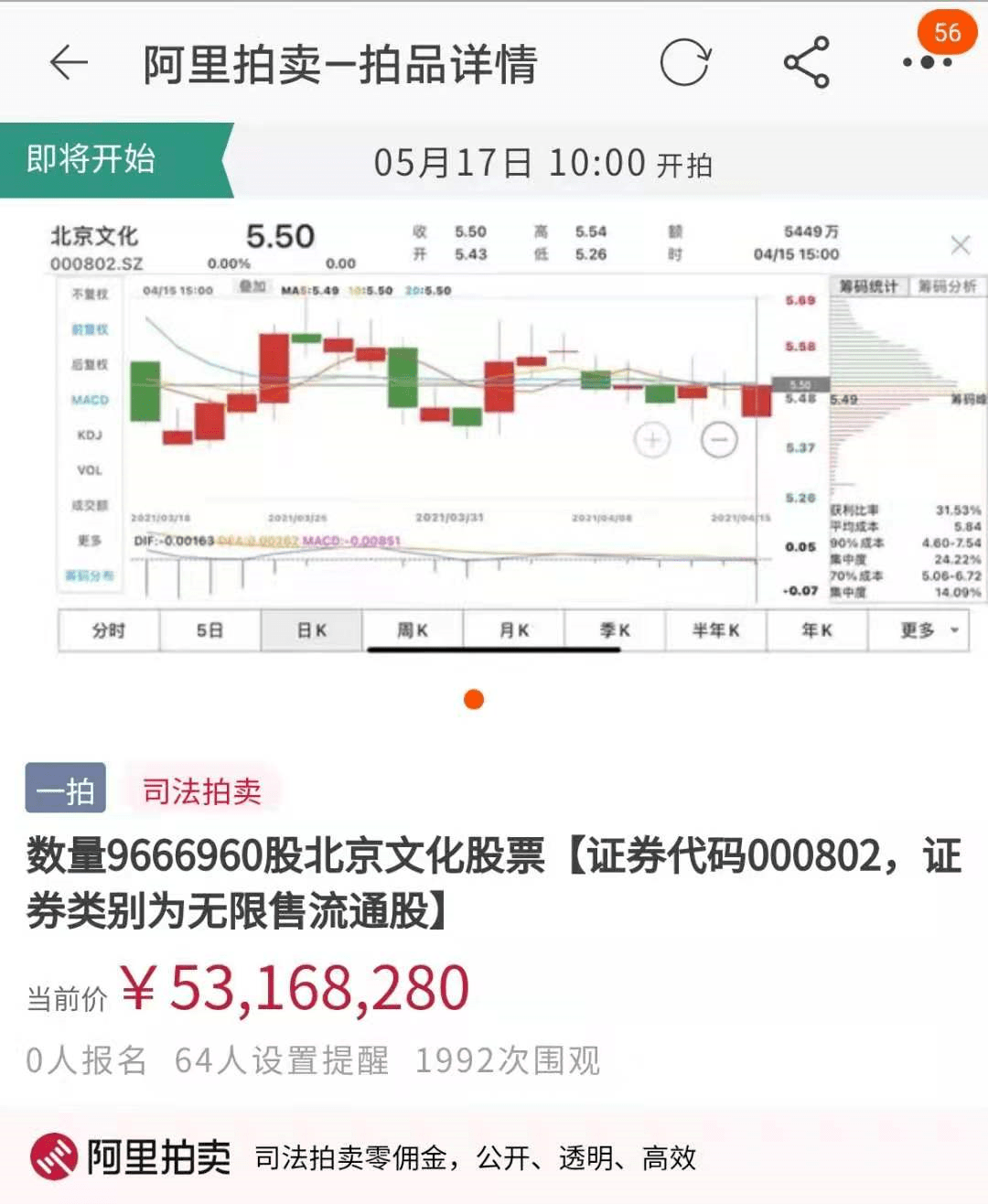 但是这并不是最惨的。今天又有噩耗传来,近1000万股北京文化的股权将于5月17日上线拍卖。
