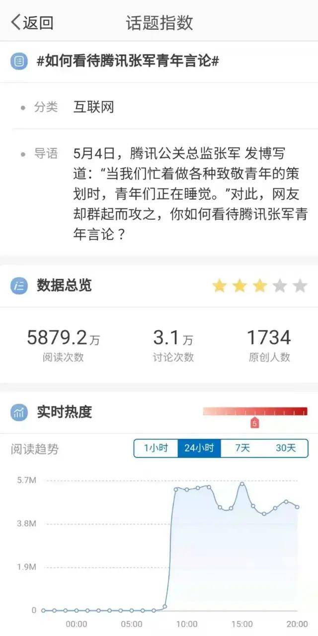 截至5月5日,这条微博下的评论数超过2.4万条,点赞183万次,转发4.5万次,远超他平日其他微博,“腾讯张军”作为关键词还登上了微博热搜榜。“#如何看待腾讯张军青年言论#”则排在热议话题第一位。