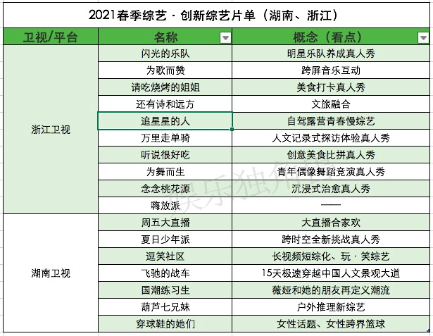 值得注意的是,对比浙江卫视这两年的片单,像《宝藏般的乡村》这样落地的、《还有诗和远方》这样仍在继续的并不多。湖南卫视与之差不多,备受期待的《喜剧不谢幕》不见了,《谁知盘中餐》进入到第二季,但更多的则是默默消失的上一批综艺名称以及快速涌现的新一批综艺概念。