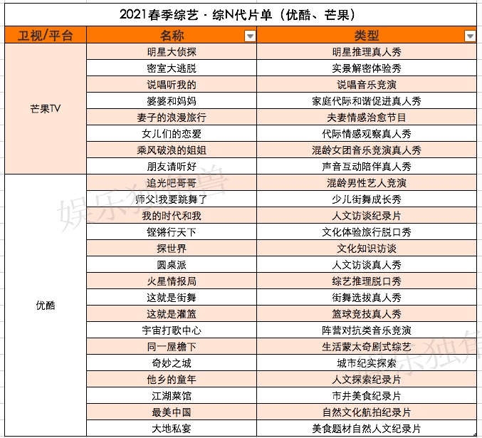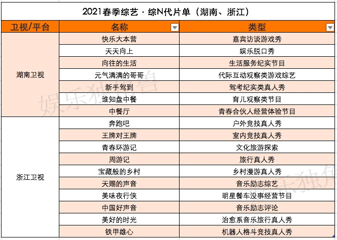 湖南卫视虽有综艺常青树《快乐大本营》《天天向上》、慢综艺鼻祖《向往的生活》,不过去年高调回归的《百变大咖秀》此番并未出现,整体综N代大盘并不突出;芒果TV延续“密室系列”和情感观察系列,口碑综艺《朋友请听好》也再次亮相。