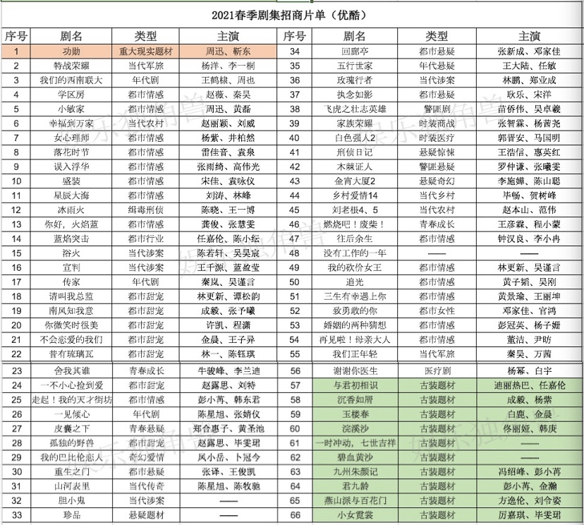 Q1凭借《山河令》《司藤》异军突起的优酷,66部剧集加持下是蓬勃的生命力和对内容布局的自信心,也让市场发出了“终于在内容制作上摸到路子了”的感慨。其实,剧集市场的角逐,逃不脱热门题材、头部制作,还有播出平台的加持,以此为牵引不难窥见四家卫视/平台107部剧集背后的市场发展。