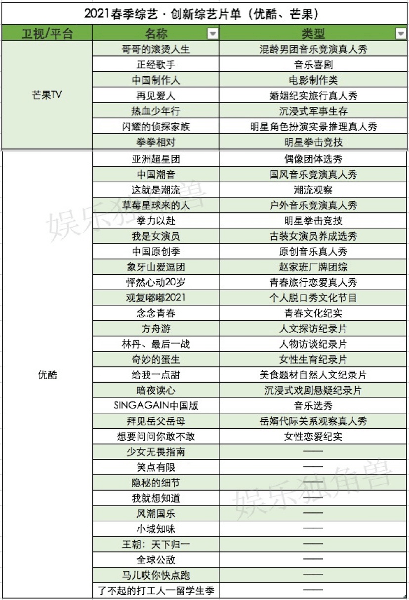 如果说2020年创新综艺是战略发展方向,2021年则是享受成果、越战越勇的一年,综N代的片单在快速迭代、市场探索的脚步愈发大胆。变则生的当下,这自然是一种利好,不过PPT盛世和“PPT神兽”的频繁出现,无异于“狼来了”的存在。