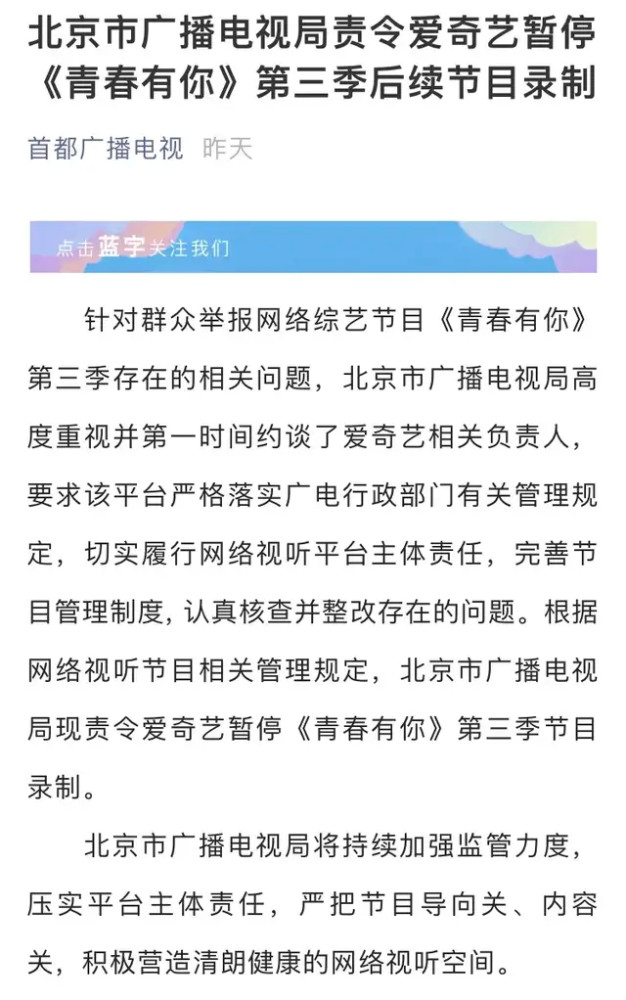 5月4日深夜,网络综艺节目《青春有你》被北京市广播电视局点名,后者责令节目制作及播出平台爱奇艺暂停本季节目后续录制。