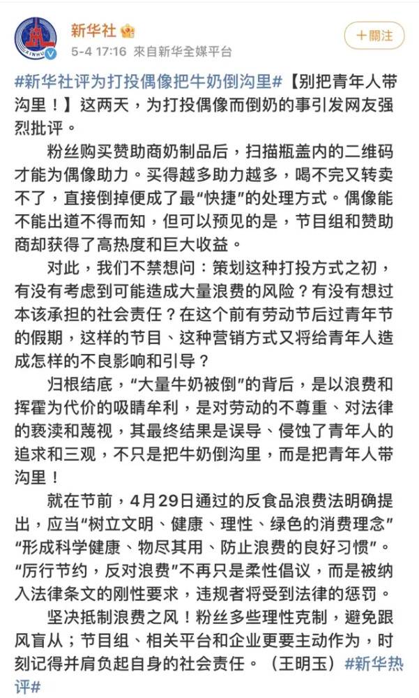 5月5日下午6点,央视新闻批评商家平台在倒奶事件中难辞其咎。文章这样写道:粉丝为给偶像刷票,扫瓶盖内二维码,只要瓶盖不要奶,成箱成箱地倒奶......这种荒诞的追星方式,背后是商家和平台的诱导。之后,包括余景天粉丝团在内,有数家粉丝团已将未使用的牛奶捐赠至福利院等机构。