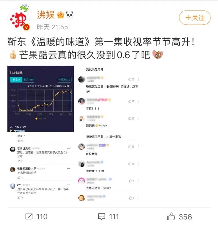 近期于市场中播出的一部献礼扶贫题材《温暖的味道》,收视率达到0.6%。如若将其放置在过往、甚至更早之前的收视数据中,这样的收视成绩堪称跌破芒果台收视,但却成为了近期靳东粉丝口中的“第一集收视率节节高”、“芒果酷云很久没到0.6了。”