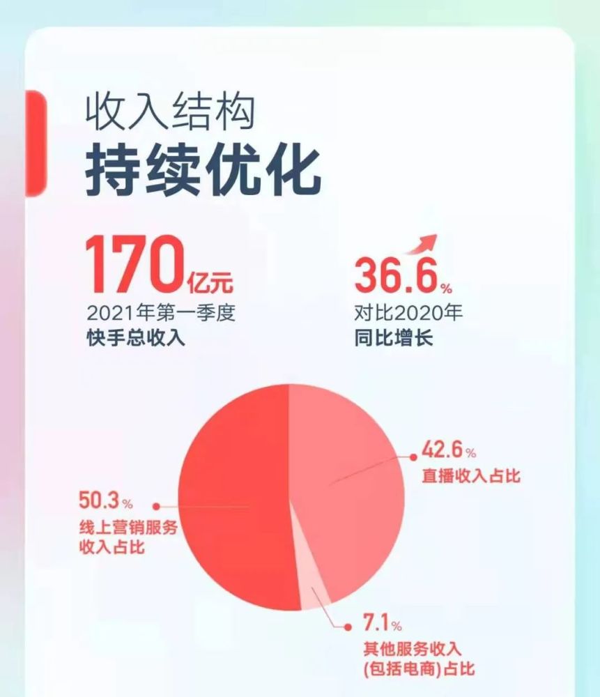 2021年Q1,快手总收入170亿,同比增长36.6%。毛利率由去年同期的 34.2% 提升至为 41.1%。较为突出的是,此次广告首次成为了快手第一大营收来源。