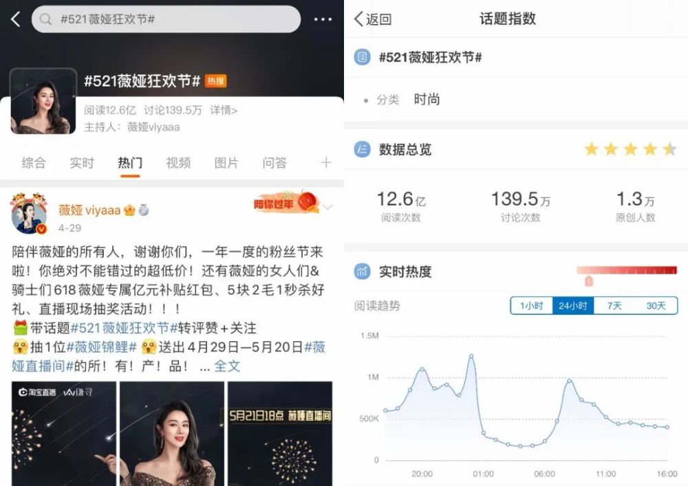 谁也没想到INTO1组合的成团首秀出现在了一场个人定制晚会上,而这场晚会还有孙燕姿、林俊杰、张惠妹等顶级歌手,以及黄子韬、张哲瀚等流量小生,甚至还连线了台北、香港、新加坡分会场,完全是卫视级别跨年演唱会的阵容。当晚,微博话题#521薇娅狂欢节#阅读量达到12.2亿,讨论134.5万。表演间隙,薇娅与她的主播团队见缝插针介绍当晚秒杀产品和618预售清单。