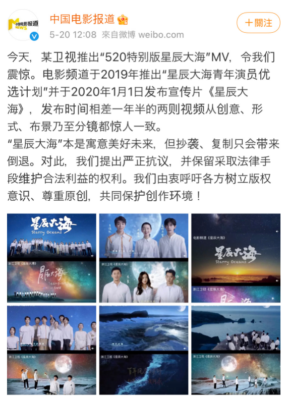 文中指出,电影频道于2019年推出“星辰大海青年演员优选计划”,并于2020年1月1日发布宣传片《星辰大海》,和浙江台发布的“520特别版星辰大海”时间相差一年半,但两则视频从创意、形式、布景乃至分镜都惊人一致。