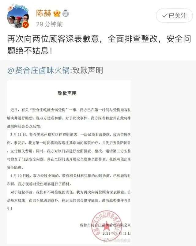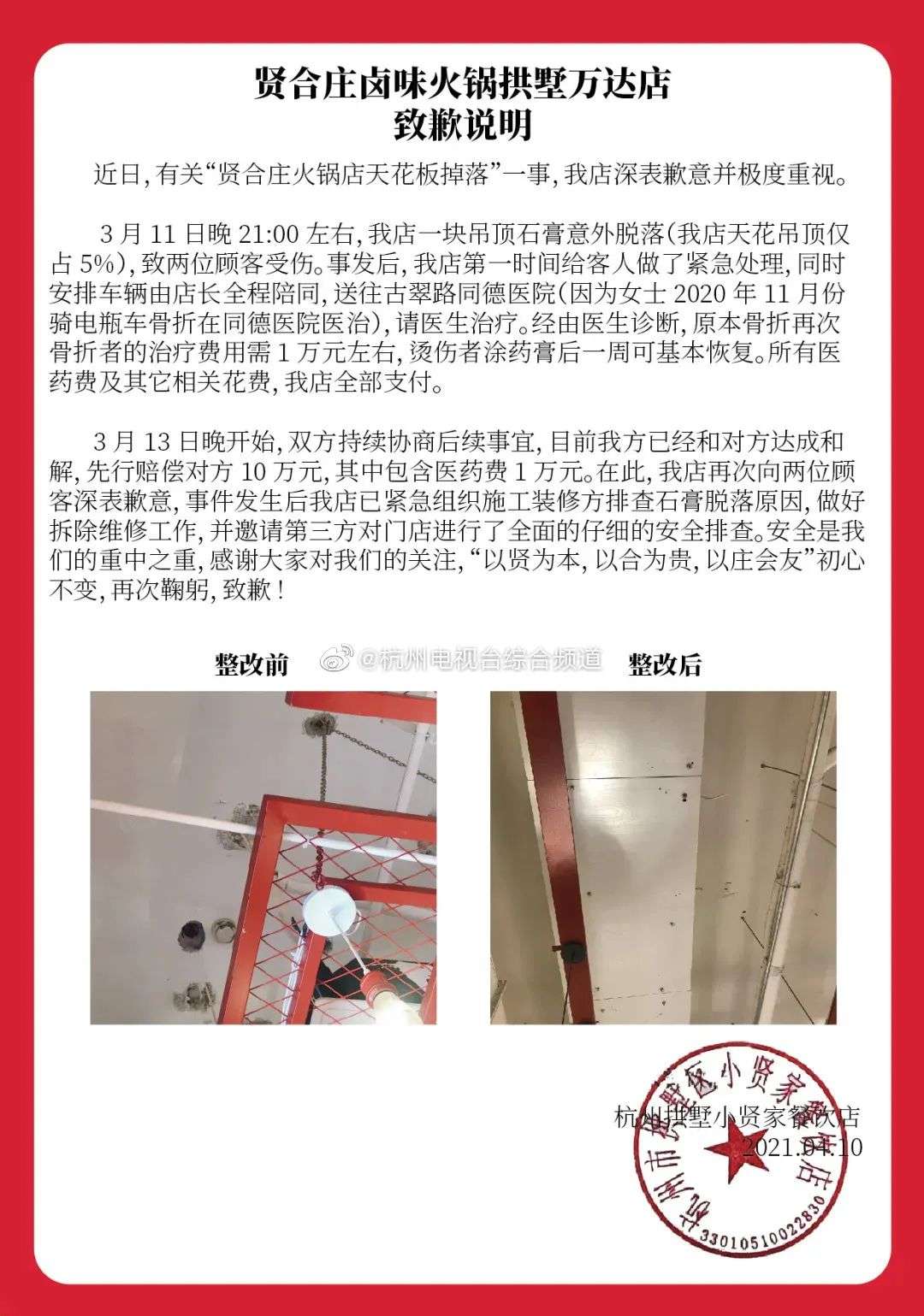 就在今年4月,杭州贤合庄某店天花板“塌顶”事件引起公众广泛关注和热议。一对年轻夫妻,慕名来到陈赫在杭州开设的火锅分店,没想到就餐时头顶上的天花板突然坠落了下来,二人双双受伤。