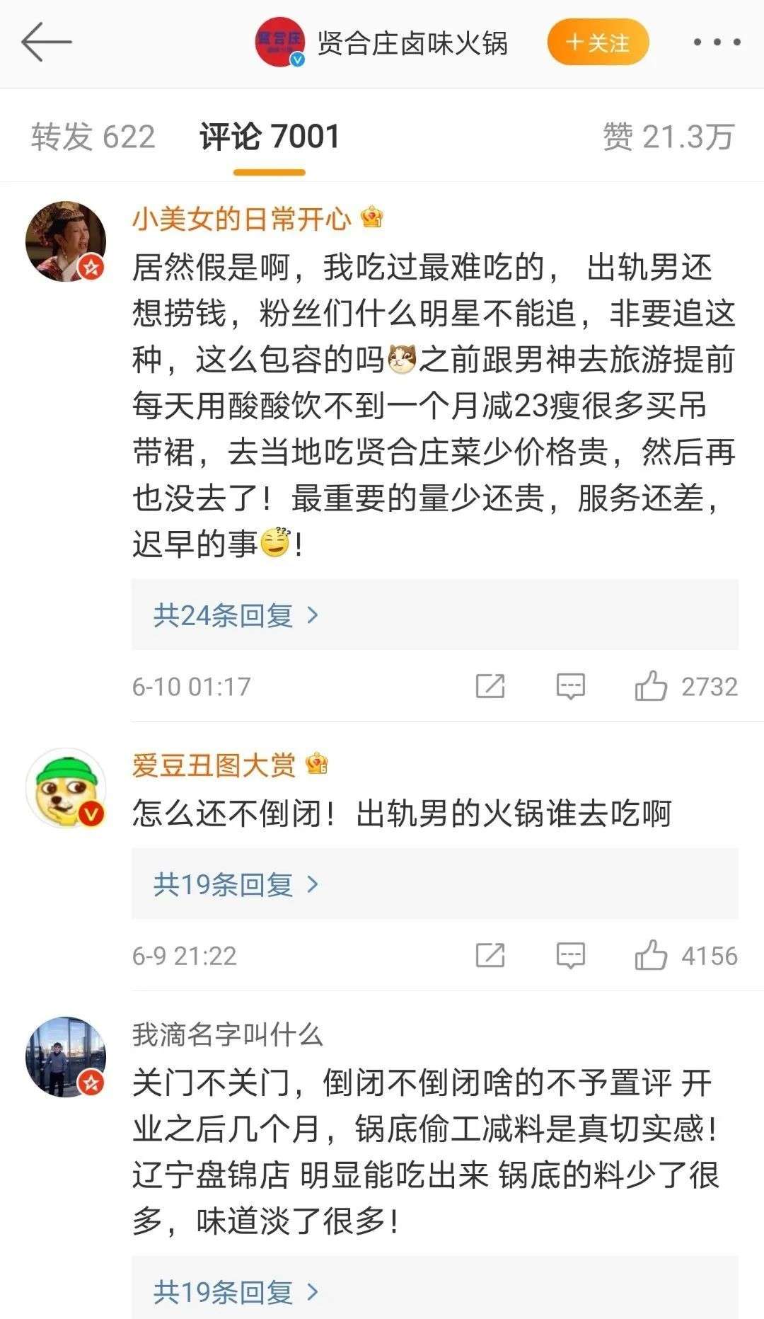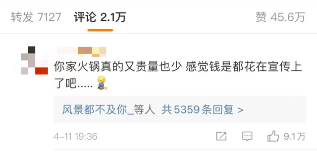 也正是陈赫在关于此事的道歉微博,成了顾客对贤合庄的讨伐场。“你家火锅真的又贵量也少,感觉钱都是花在宣传上了吧”,单条评论点赞量9.1万。