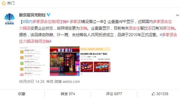 6月9日,一个#国内多家贤合庄倒闭注销#话题冲上热搜,再次让明星陈赫进入大众视野。原因是新京报报道,近期国内多家贤合庄火锅店变更企业状态,由存续变更为注销。企查查显示,目前有关贤合庄餐饮店已有30家注销。