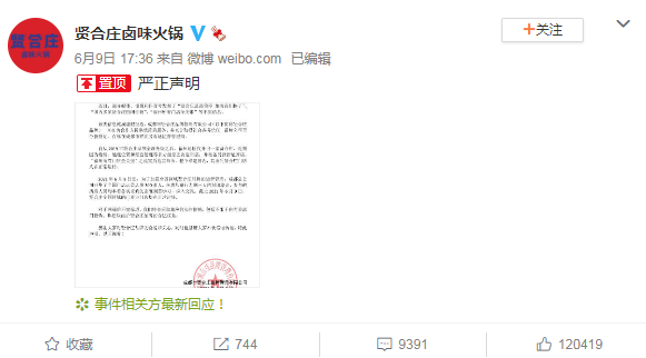 对于这样的负面,一般品牌是忍不了的。于是6月9日下午,贤合庄的一纸“严正声明”就已祭出。