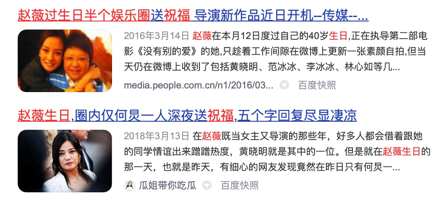 该事件后,赵薇关闭微博评论,只转载公益相关微博。更鲜明的对比是,2016年3月,赵薇过生日时,得到了李冰冰、范冰冰、林心如等半个娱乐圈的祝福。到了2017年则寥寥无几。