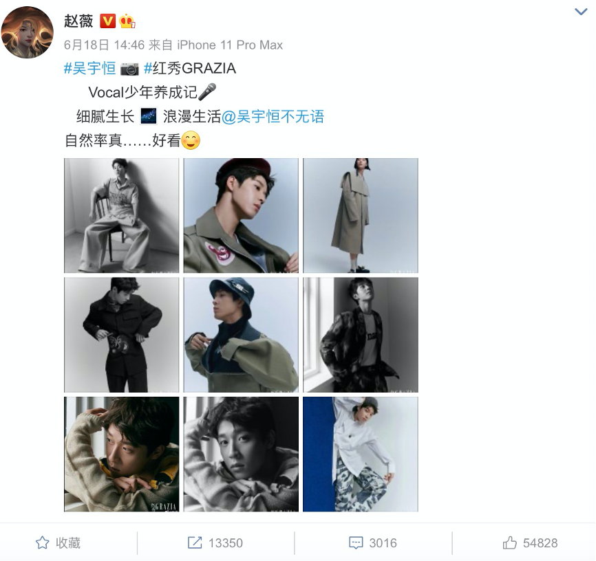 比起王智,能明显从赵薇的微博看出来,她转载最多、最捧的是男艺人张哲瀚和吴宇恒。吴宇恒在参加《创造营2021》前,还不曾在娱乐圈拥有姓名,就有大量通稿、疑似水军称他外形酷似肖战。赵薇在自己代言的Fendi时尚活动中,只邀请了吴宇恒和张哲瀚一起拍摄。