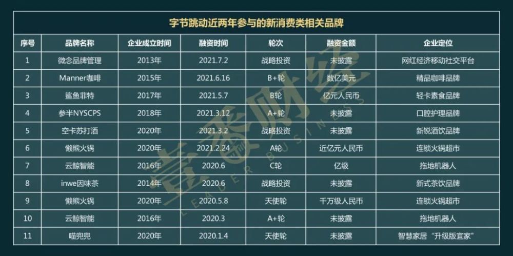 据企名科技数据显示,字节跳动战略投资部于2020年对外共投项目38起,2021年以来,已投资37起,新消费相关共计至少11起。