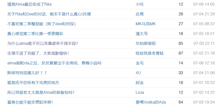 从豆瓣评分看,《顶楼》三季得分分别为6.7、7.6、7.0,总体来说波动不大。同样六月回归的《致命女人2》就没那么幸运,第二季目前评分为8.4,低于第一季整整1分,热度也表现也呈下滑趋势,不如第一季基本上周周有讨论。