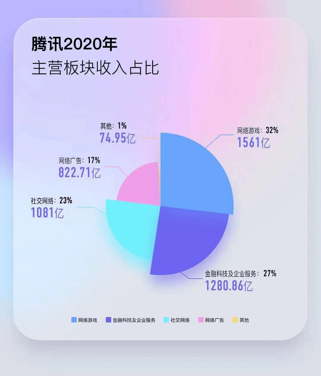 投资轨迹的变化背后,游戏在腾讯整体业务比重发生了微妙变化。2014年-2015年,网络游戏收入占腾讯总收入比重分别为56.70%、55.01%,2016年,网络游戏收入占比首度降至46.62%,2020年,这一比例更是降至32%。