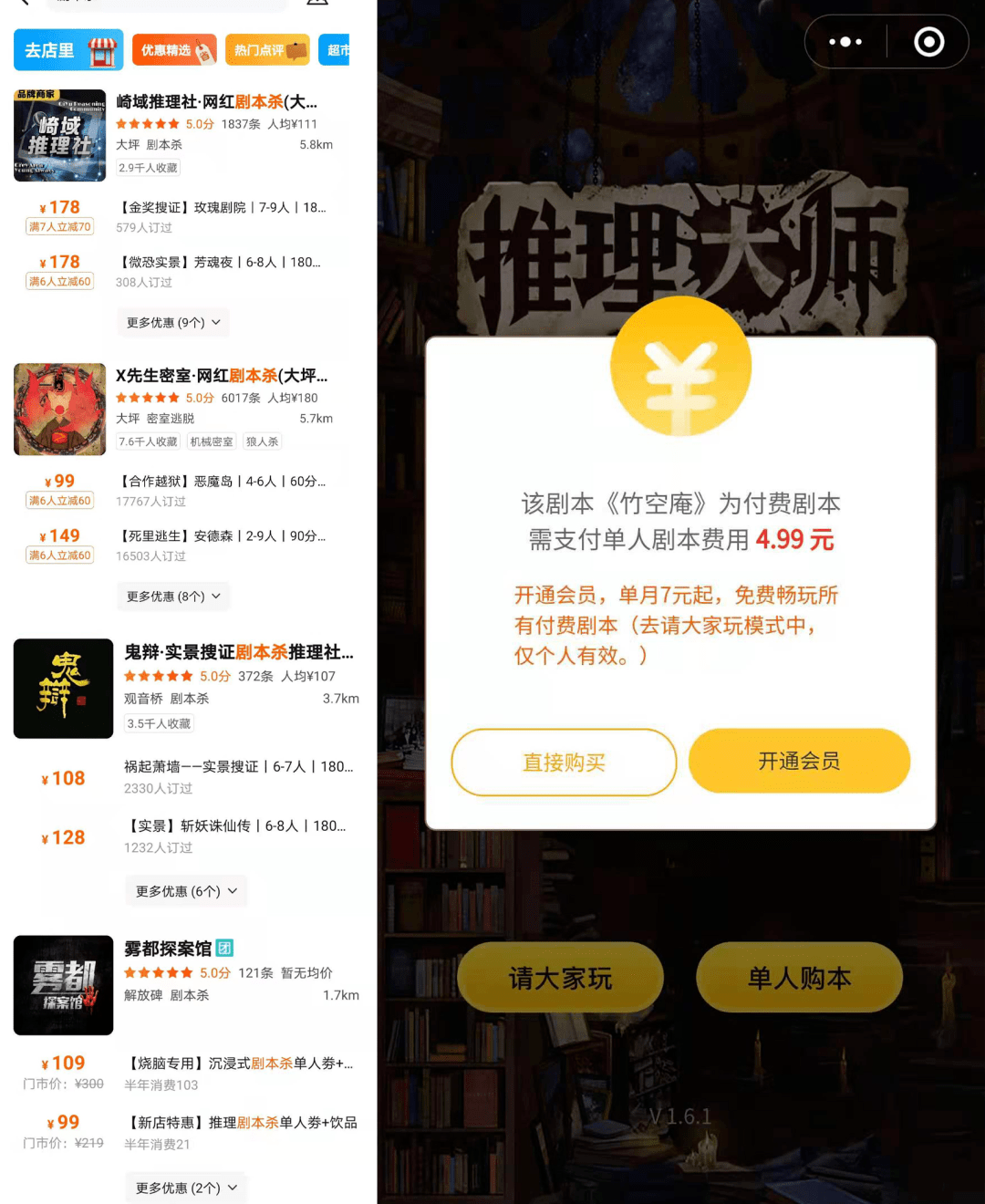 山竹的一位朋友跟她抱怨剧本杀线下实体店单价贵时表示:“现在玩盒装本要70元起步,城限本(一个剧本在一座城市仅向限定数量的店铺授权购买使用)要100元起步,独家本(一个剧本在一座城市仅授权一家店铺购买使用)要130元起步,这些都还只是在桌面上玩的,而那些场景更讲究、提供服装道具的‘沉浸式’剧本杀,价格更是要两三百一局,真是太贵了,我们在线上小程序玩一局剧本杀最贵也就花了6块钱。这钱我拿去买点好吃的、去看电影、跟大家一起租个场子打羽毛球、甚至是给游戏充值,感觉都比花钱在店里坐一下午划得来。”