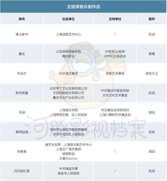 通过整理可以发现,多数红色音乐剧都有政府部门参与出品、甚至是制作环节的指导,出品方也是北京演艺集团、上海话剧艺术中心这样的单位,并属于不同文化艺术基金的扶持重点项目。