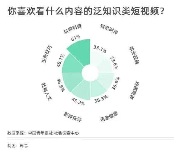 前不久,中国青年报社社会调查中心通过问卷网,对2015名受访者进行“泛知识”领域视频进行观感调查。63.9%被受访者指为泛知识类短视频存在的最大问题就是 内容同质化现象严重,而50.3%的人认为泛知识类视频存在 传播伪科学的现象,43.6%的受访者指出泛知识类短视频 侵权问题多发。