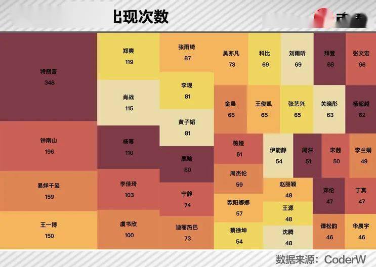 程序员CoderW统计了2020年的35901条微博热搜数据,热搜次数最多的40个人里大部分都是娱乐圈人士。比如,因涉嫌强奸罪被批捕的吴亦凡出现过73次,肖战出现过115次,郑爽出现过119次。