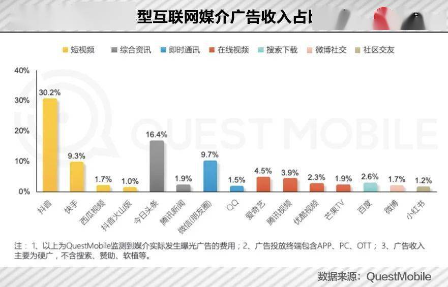 据QuestMobile发布的2021年上半年报告,主要以硬广投放做统计的话,在典型互联网媒介的广告收入分布上,抖音占比达到30.2%,微博占比仅为1.7%。